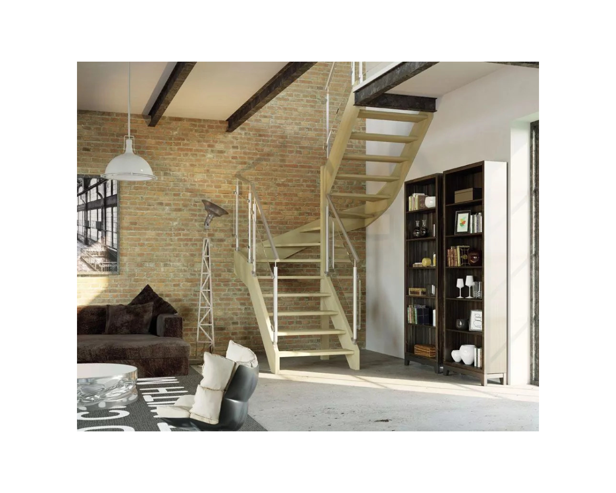 Type et Structure: Il s'agit d'un escalier demi tournant , caractérisé par des marches à pas alternés sur la section montante principale. Ce design permet de réduire l'encombrement au sol tout en offrant une foulée sécurisée.