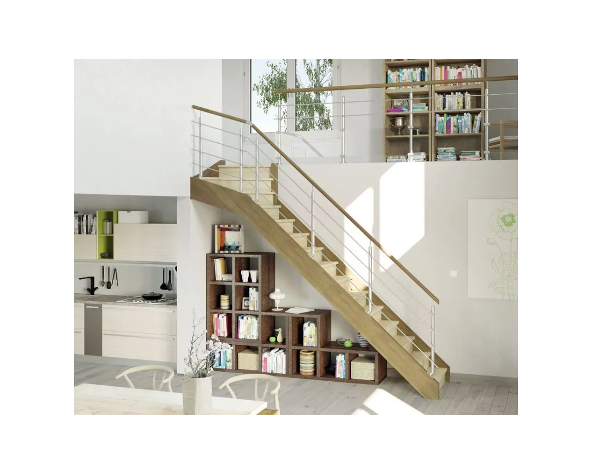 Design Courbé et Accueillant : Sa configuration en quart tournant bas avec des marches balancées crée une ligne douce et accueillante. La structure entièrement en bois clair et naturel s'harmonise parfaitement avec les cuisines et les parquets, créant une continuité visuelle réconfortante.