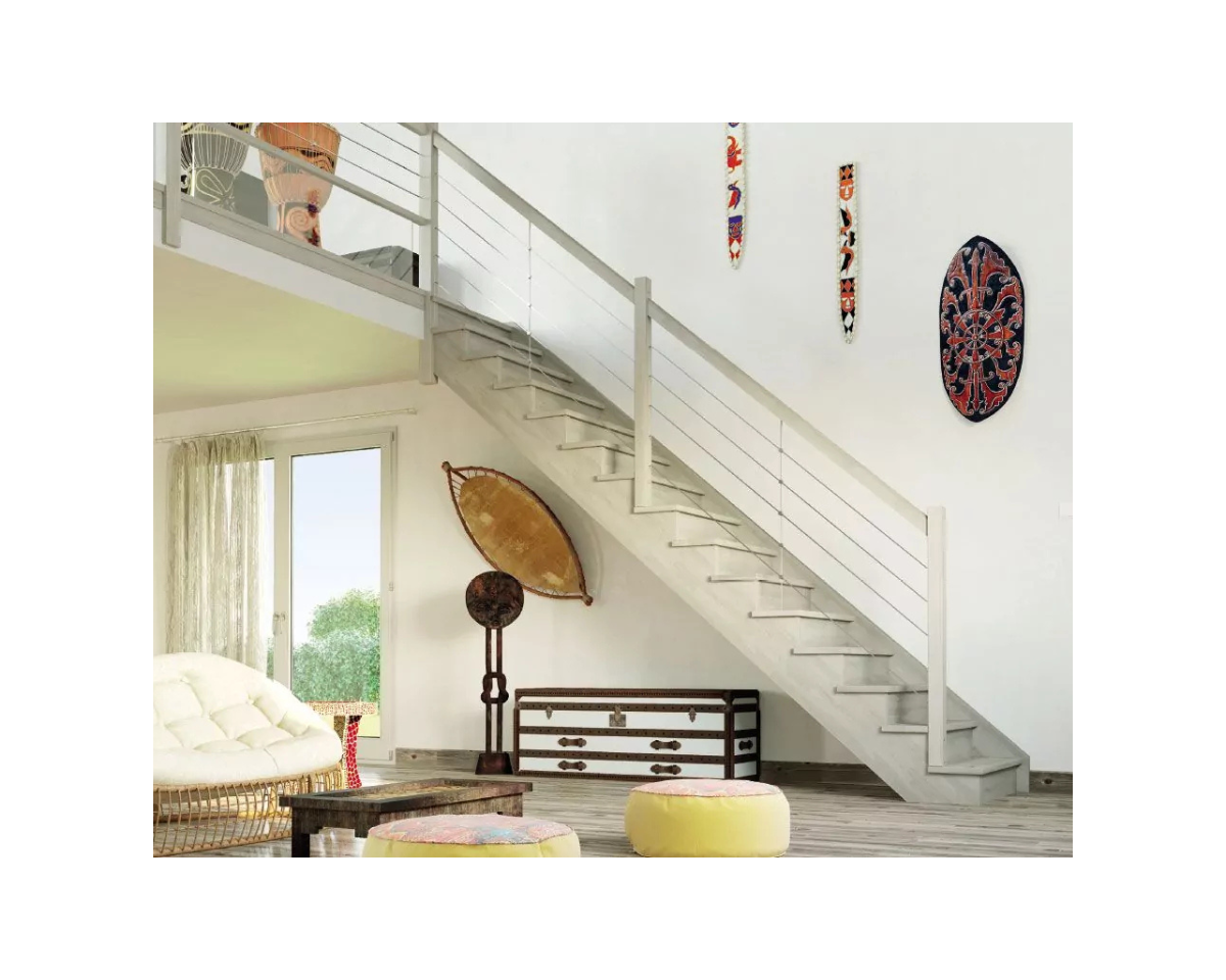 Design Flottant : Légèreté Visuelle Assurée la structure asymétrique et l'absence de contremarche créent une sensation d'ouverture. Le garde-corps transparent (verre et câbles inox) maximise l'entrée de lumière naturelle.