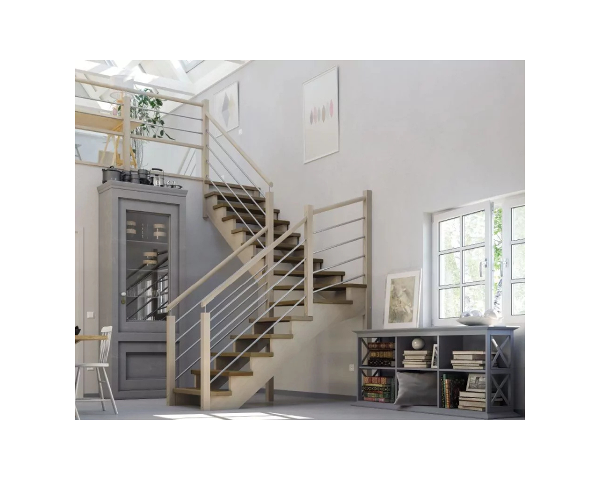 Structure Apparente : Le Caractère du Bois La présence de deux crémaillères excentrées bois confère un style contemporain et technique, exposant fièrement les supports de marches. C'est un choix de design fort pour les pièces ouvertes.