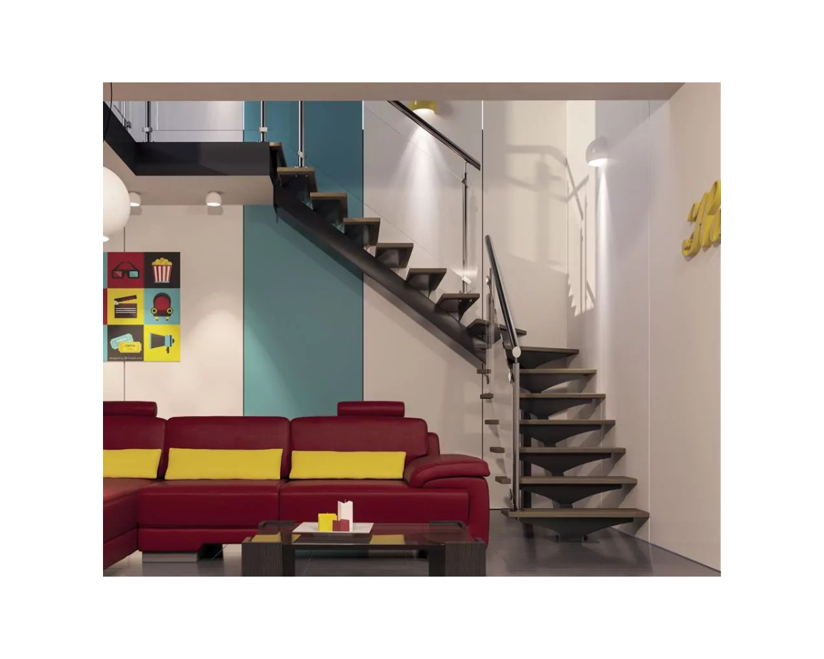 Matériaux de Prestige Exotique Chaleureux : Les marches en Exotique lamellé collé sont protégées par une huile teinte marron terre, offrant un aspect riche, profond et durable. Le bois s'équilibre parfaitement avec le métal sombre de la structure.