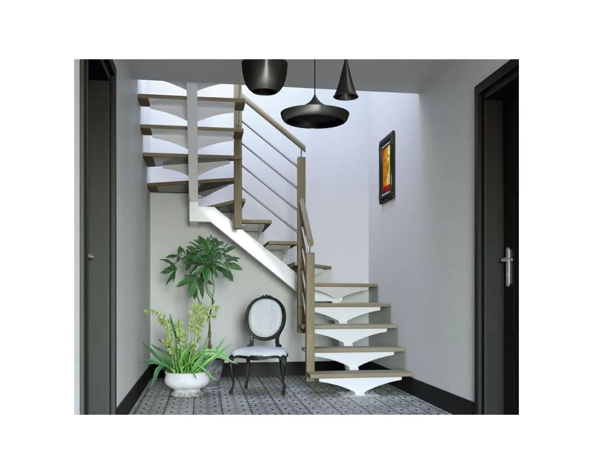 Forme Complexe :Tracé Maîtrisé et Spacieux la configuration en double quart tournant avec jour (ouverture centrale ou palier intermédiaire) est idéale pour les grands espaces et les trémies carrées, optimisant la circulation tout en offrant un design articulé et majestueux.
