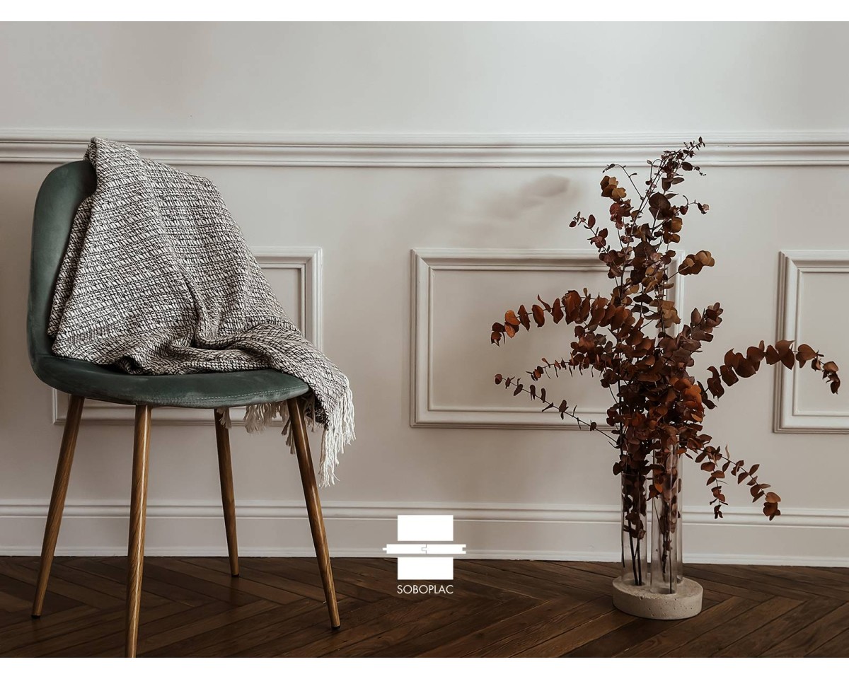 Des moulures en pin massif (pin merkusii densifié (gemmé) 730 KG/M3) revêtus de gesso (un bicarbonate de calcium dérivé de la craie) pré-coupées à une dimension de 400 mm avec un angle à 45°. Prêt à poser.