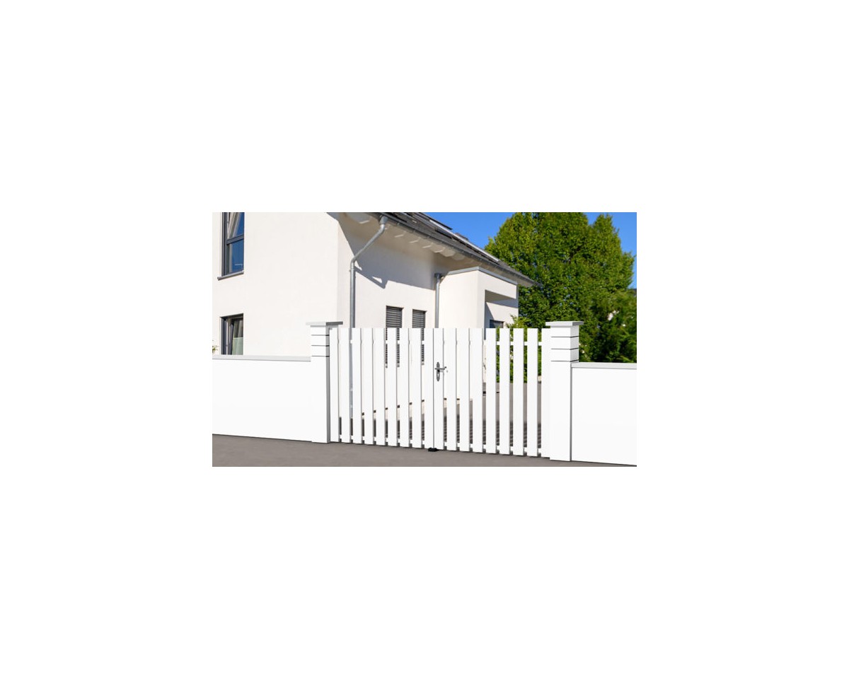 Sobre et ajouré, le portail PVC CA 03 allie élégance et légèreté.