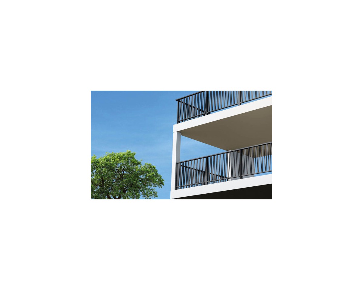 Le modèle Mokaïte est un garde-corps en aluminium et au design barreaudé.