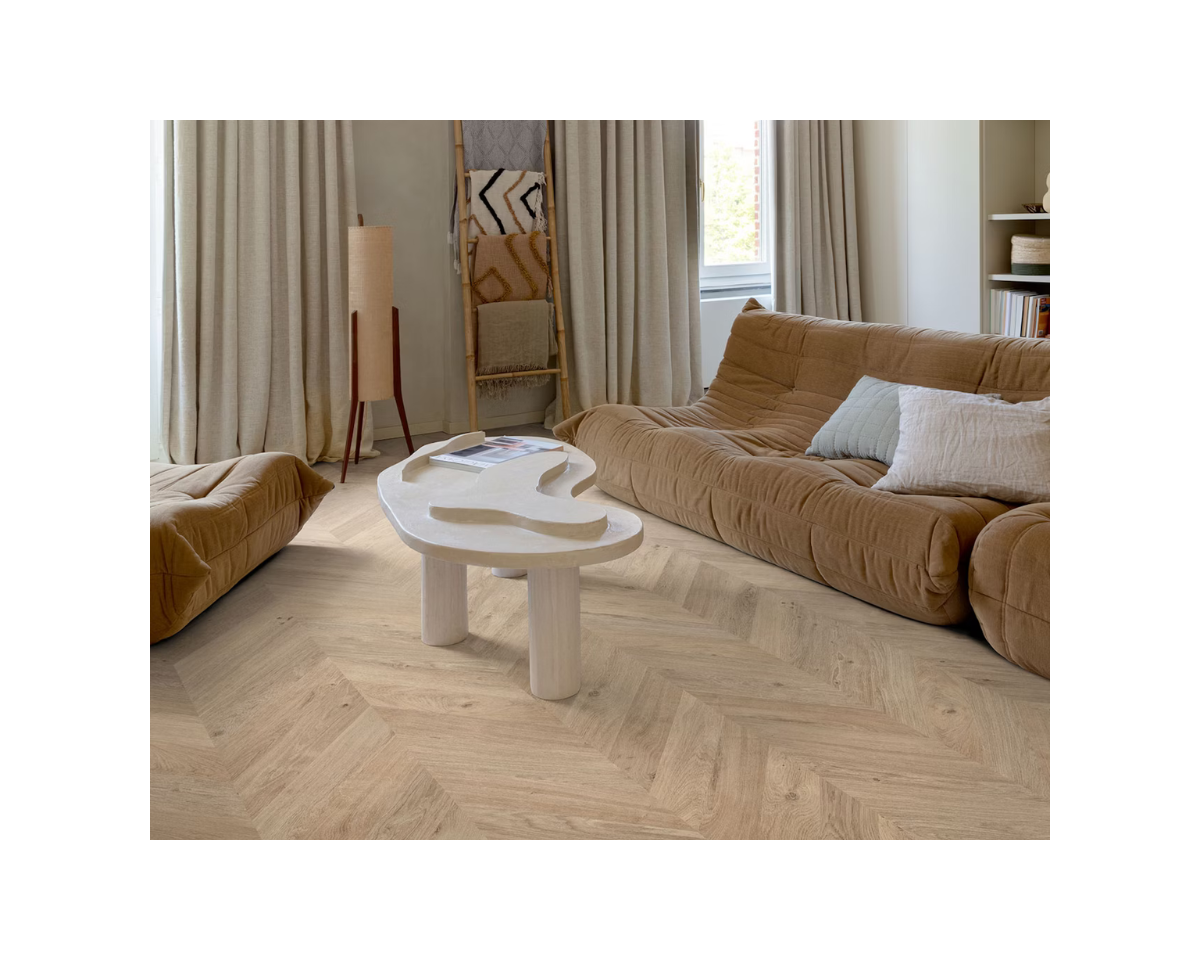 Floorify Chevron Odette – Intemporel, chaleureux et plein de caractère. La teinte chêne naturelle en motif chevron apporte à votre intérieur une allure exclusive et pleine d’ambiance. Le luxe d’un parquet haut de gamme, mais étonnamment simple à installer grâce aux grands panneaux et au système de clic ingénieux. Vous profitez ainsi en un rien de temps d’un sol qui allie élégance et facilité.