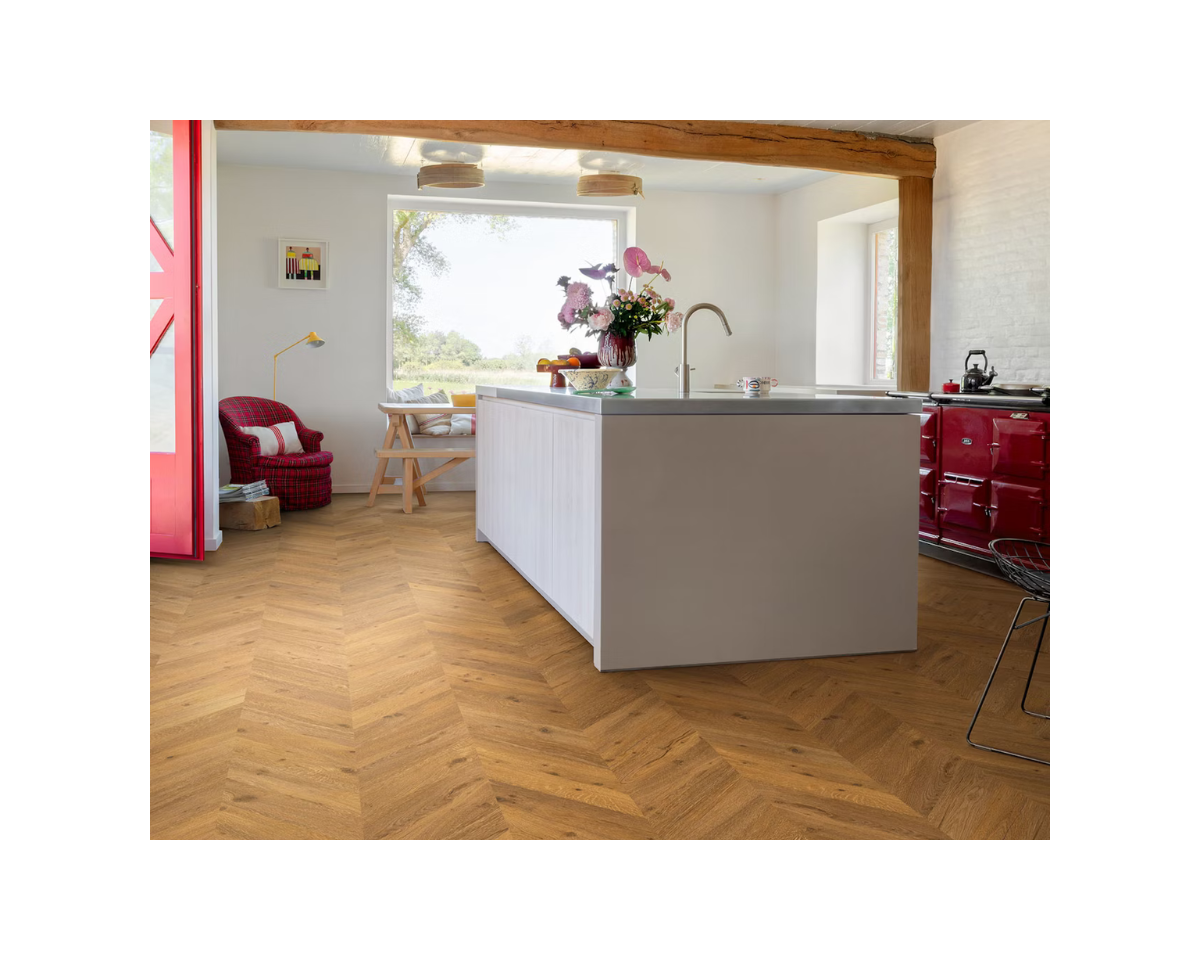 Floorify Oscar – Élégance raffinée dans un motif de point de hongrie intemporel. Avec son aspect chêne foncé et ses veines subtiles, Oscar apporte une apparence luxueuse et pleine de caractère à chaque pièce. Grâce au système de clic innovant et aux grands panneaux, vous pouvez poser ce sol facilement et rapidement – sans colle, sans tracas. Idéal pour ceux qui recherchent un sol durable, élégant et facile à installer.